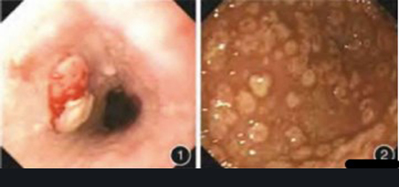 胃镜检查示:距门齿约22 cm处远端食管至贲门散在大小不等结节样隆起(图1),大小从0.5 cm×0.5 cm至0.8 cm×0.8 cm,表面黏膜充血、糜烂;全胃黏膜充血水肿,胃底、胃体、胃角、胃窦、十二指肠球部及降部近端黏膜弥漫分布大小不等的扁平、黄白色、菊花瓣样隆起(图2),大小约从0.5 cm×0.5 cm至1.0 cm×1.0 cm,顶端糜烂。胃镜下于食管隆起病灶多处取材5块,于胃窦部4处病灶取材4块,活检病理示印戒细胞癌(食管处)、低分化癌(胃窦处)。