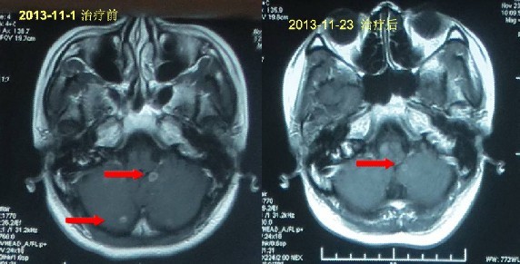简要病史:经过朋友推荐来到广州中医药大学金沙洲医院医院进行检查,检查后诊断右肺上叶肺癌,纵膈淋巴结转移,腰椎转移,心包积液,多发骨转移,多发脑转移,手术风险很大,朋友、家人都着急了,患者自己也慌了,听从专家的安排,进行多学科综合治疗治疗:WB-1无创全身热疗系统+P53基因治疗,两个疗程之后,患者健康恢复显著,半个月患者出院。