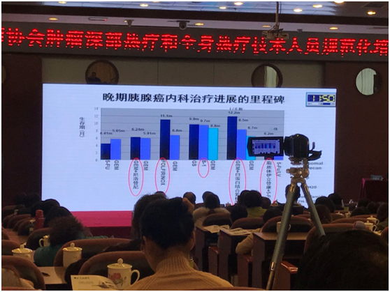肖邵文主任用各种实验数据像我们展示基因药物结合放疗、热疗治疗晚期软组织肿瘤的疗效及安全性。实验表明组织瘤内注射rAdp53结合放疗、热疗是安全而有效的,rAdp53是一种很有潜力的治疗恶性软组织肿瘤的基因治疗药物。另外肖邵文主任还首次展示治疗晚期胰腺癌内科治疗取得的极大进步。(具体数据可见图四)