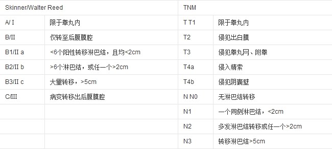 睾丸癌患者在进行血清学化验、胸片、腹部或盆腔CT等检查后。应接受腹股沟入路根治性睾丸切除术。后续治疗主要依据临床分期、肿瘤组织学特点和肿瘤标记物状态来进行。下表为睾丸生殖细胞肿瘤的分期。